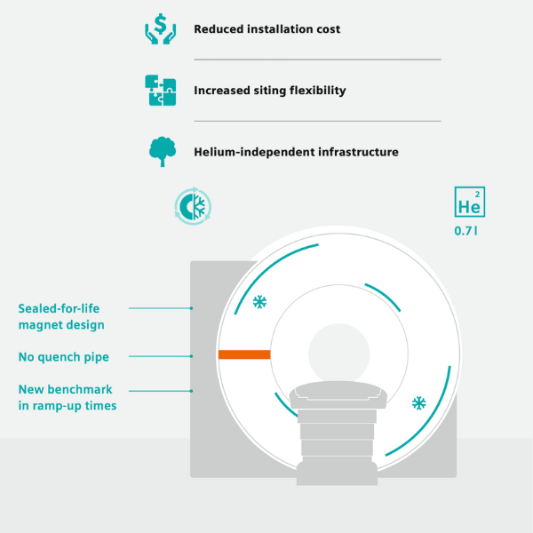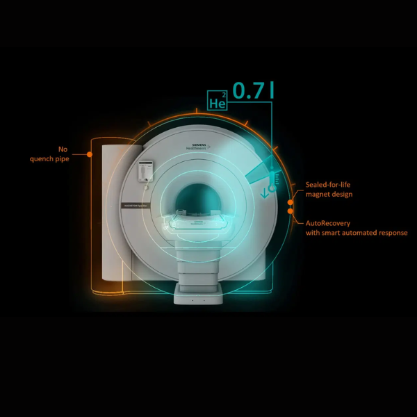 Basado en la innovadora tecnología High-V MRI (0.55T), el MAGNETOM Free.Star combina digitalización, técnicas de adquisición eficientes y reconstrucción con deep learning, proporcionando diagnósticos confiables tanto en estudios de rutina como en nuevas aplicaciones clínicas. Su diseño helium-free, sellado de por vida, elimina la necesidad de recargas y reduce significativamente los costos operativos y de mantenimiento.