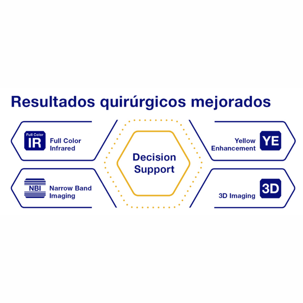 Integra una fuente de luz LED con IR en color para una reproducción tisular natural, junto a un cabezal de cámara 4K ultraligero con CAF y EDOF, que garantiza imágenes nítidas y enfoque continuo. Su monitor médico LCD 4K 2D/3D con HDR y A.I.M.E. realza estructuras críticas para una visualización superior.